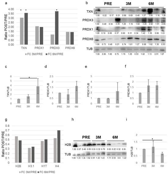 Figure 6b shows a representative Western blot analyses for these proteins from the varicocele group before (PRE N = 4) and 3 (3M N = 3) and 6 (6M N = 4) months after varicocelectomy. Densitometric analysis (Figure 6c–f) confirmed an overall increase in these proteins that was significant for TXN. Figure 6g shows the ratio (FC-fold change) of POST/PRE proteomic quantification at 3 (3M) and 6 months (6M) for different histone proteins: H2B, H3.1, H1T and H4. Figure 6h shows the Western blot analyses for H2B protein from the varicocele group before (PRE N = 4) and 3 (3 M N = 3) and 6 M N = 4) months after varicocelectomy. Densitometric analysis (Figure 6i) confirmed a significant decrease in this protein six months after surgery.