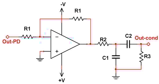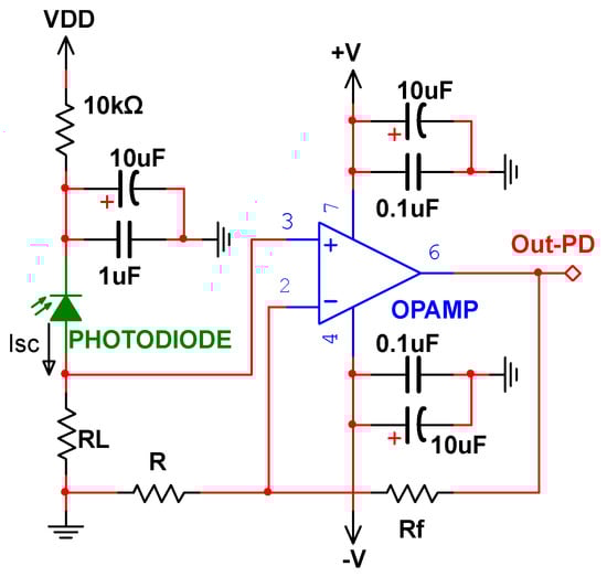 represents the light reversed current delivered by the PD. is the load resistor that converts the modulated light current into a voltage signal using Ohm’s Law. and are the voltages supplied by the OpAmp. is the voltage source that polarizes the PD inversely, and Out-PD represents the output signal given by: