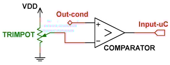 After the amplification and conditioning stages, the received signal is transferred to a pair of complementary but independent processing circuits, the digitalization and peak detector stages. The digitalization module enables the MCU to decode data sent by the lamps. The whole circuit includes an IC comparator, an MCU’s digital input, and a trimpot, as shown in Figure 3.