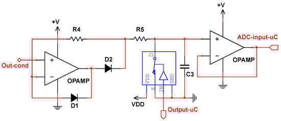 The digitalization stage was achieved using one of the two low-power comparators in the IC TLV2352 from Texas Instruments and a trimpot of 10 k, which sets the reference voltage. The output of this stage is connected to a digital input of an MCU MSP430G2553 of Texas Instruments. Finally, the peak detector was implemented using a Texas Instruments SPST CMOS analog switch TS12A4515 and a dual OpAmp integrated circuit OPA2350.