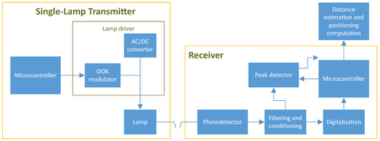 The peak detection co-occurs with the decoding process. Once the MCU starts receiving data from a lamp, it sends a digital signal to open the SPST analog IC switch. From this, the capacitor is charged to hold the voltage amplitude of the stream data during decoding. Once the capacitor holds the signal, the MCU can periodically read this voltage signal using its built-in ADC module (the Sampling and Hold (S/H) process). Moreover, after the MCU completes decoding the data packet, it changes the digital output connected to the peak detector to discharge the capacitor. In this way, the peak detector is ready to receive a new data stream from another lamp. Lastly, the data obtained from the decoding (digitalization) and S/H process (peak detector) are processed by the MCU or a computer to estimate the object’s positioning. Figure 5 shows the interaction of all components of the proposed system.