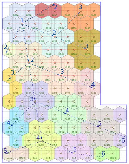 Example of the system deployment. The synchronization links are depicted by blue arrows. Blue numbers represent the absolute delay of the different cells. Location cells are identified by colors.