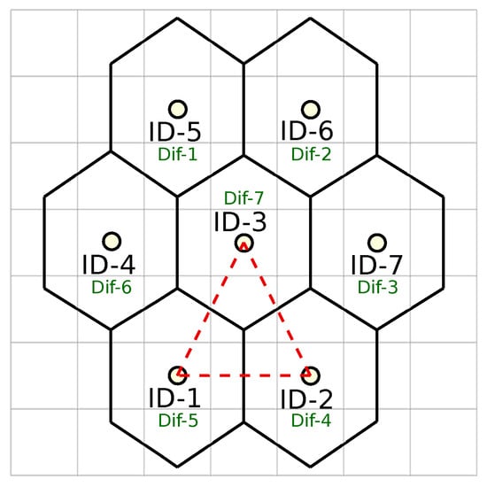 A localization red triangle in the cell is highlighted to improve precision. Figure 8 and Figure 9 should be looked at closely. So, several localization triangles (represented by the dotted red line) form and join the different primary and special localization cells across the arrangements. The localization triangle is the functional unit of the system; therefore, its requirements and limitations are extended to the entire system. Thereby, the system requires at least three lamps to operate, and its accuracy will depend on the experimental accuracy reached by the localization triangle. In the proposed system experiments, the receiver will capture signals from more than three lamps. For those cases, the signals acquired by the receiver should be sorted by their signal strength, choosing the highest three to compute the trilateration.