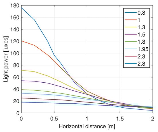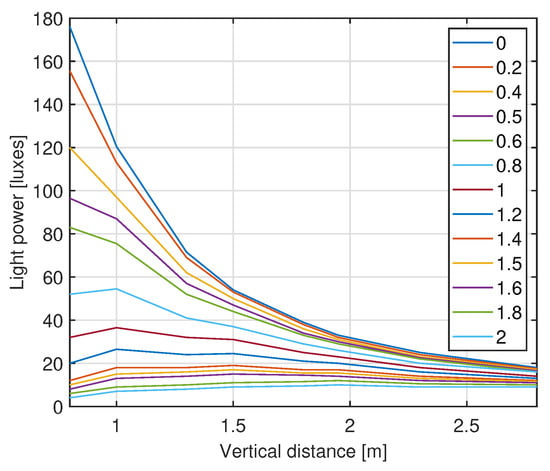 Moreover, it is possible to obtain the behavior of the light power when a receiver is moving in a horizontal plane using the same experimental data but changing the approach in which the data is analyzed. The new analysis approach to the experimental data is shown in Figure 16.