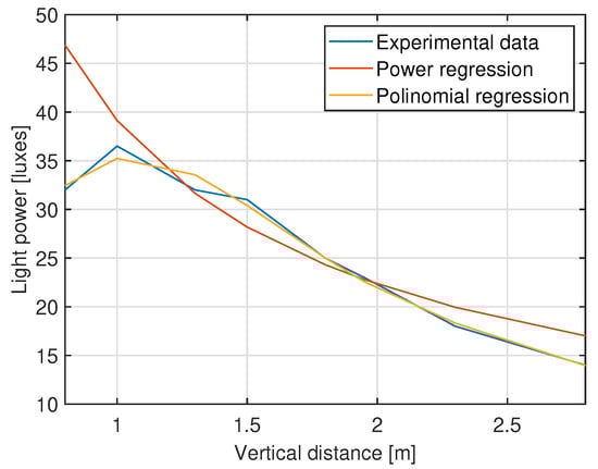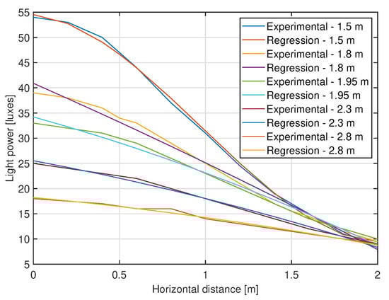 Next, (11) is used to conduct a comparison with the obtained experimental results. Two regression models serving as ground truth were obtained using the power light measures. The power light estimated just beneath the lamp (radius = 0 m, angles and are unchanged) is given by: