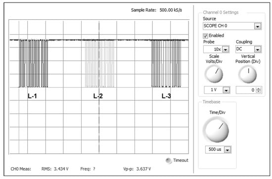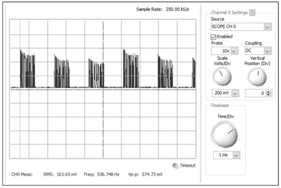 The Quadrant Si PIN photodiode s4349 from Hamamatsu was used in the receiver circuit. The IC used to amplify the signals captured was the current feedback amplifier AD8001 from Analog Devices. In addition, the values for the resistors Rf, R, and RL in the amplification module were 10, 1.0, and 100 k, respectively. The ultraprecision OpAmp AD8676 from Analog Devices was used in the conditioning stage. The first part of this circuit is an inverting buffer implemented using one of the OpAmps in the AD8676 and two resistors of 10 k. The second part of the conditioning stage is a pass-band filter implemented utilizing passive elements. One resistor of 1.0 k and one capacitor of 1.0 nF are used to obtain a low-pass filter (cutoff frequency of 160 kHz), and a resistor of 1.0 M and a capacitor of 10 nF define the high-pass filter (cutoff frequency of 16 Hz). Figure 20 shows the signal captured by the PD after applying the conditioning stage.
