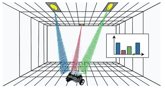This work is based on a preliminary study proposed by Avendano López et al. []. The current study proposes a visual light positioning system that utilizes commercial LED lamps as transmitters. The lamps are modulated using On–Off Keying (OOK) and the Manchester code. This scheme allows retrieving the synchronization signal on the receiver side, avoiding noticeable changes in the light intensity caused by different transmitted streaming data. The light signals are transmitted and received using Intensity Modulation and Direct Detection (IMDD). The medium access control uses Time Division Multiplexing (TDM) compared to most commercial systems, which use patterns and digital image processing to estimate the position []. IMDD, instead of patterns, enables a higher bandwidth for data transmission and more satisfactory reliability of the retrieved data. Contrarily, TDM allows the communication of data sequentially without noticeably affecting the intensity of the lighting system. The receivers based on Silicon PIN photodiodes offer a high-speed response and sensitivity to light intensity changes. The information captured by these sensors is used to estimate the object’s position by the trilateration principle. In addition, the system was designed to be scalable, replicating a functional unit named primary location cell and drawing on the spatial multiplexing feature of the light. The proposed framework enables a refresh rate fast enough to obtain real-time system operation. Ultimately, the system test performance delivers an accuracy of about cm on the estimated position. The main contribution and novelty of this work lie in formulating a complete mathematical model for the object’s location using visible light. This model comprises two submodels: the former corresponds to the power of the source of light, and the latter corresponds to the location of an object through the trilateration using a minimum of three light sources. These models were implemented and verified experimentally.