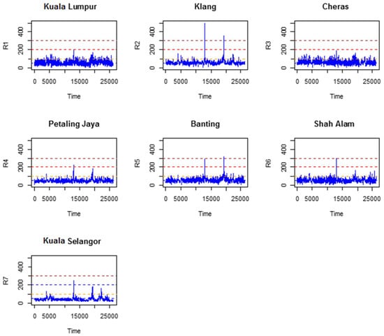 When the API value exceeds 100, the air pollution states become unhealthy, suggesting that the air quality status is harmful to public health. Thus, assessing the risk of an API that is greater than 100 is critical, particularly in urban settings. Before going into the study in-depth, some descriptive statistics and time series plots of the API time series are determined, to provide basic information about the variables in a dataset and to derive insights into the air pollution data used in this study, which might support the results of the analysis. Table 1 presents a descriptive statistics summary of the hourly API data; it is observed that the maximum API values in the year 2013 were 495 and 323 for Klang and Banting, respectively. The API’s mean, for all the stations considered, ranged from 40 to 57, indicating that the hourly API’s mean is at a moderate level for all stations. In addition, the standard deviation of the API ranged from 16 to 25, and proportions of the API values exceed 𝑢, where 𝑢 = 100, 200, and 300, indicating that some unhealthy air pollution episodes occurred in the studied area, varying from station to station.