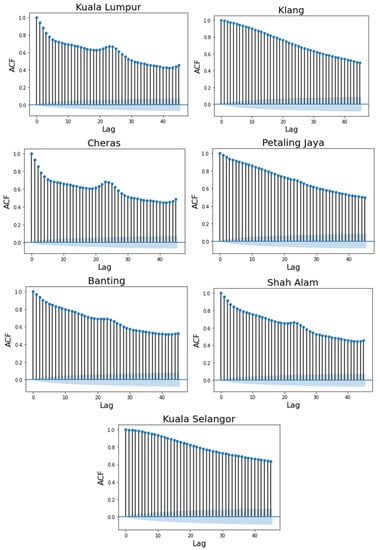 Based on the studies by [,,], for API data, the first-order MC can derive appropriate insights into the transition probability for the behavior of air pollution, and offers a description of the transition probability’s dependency structure in terms of time. However, it is important to examine the appropriateness of the MC with a higher order of dependency on its past data. Accordingly, in addition to the first-order MC, it might be useful to fit the high-order MC to investigate the dependency of the preceding states on the current state. This may reveal information about the dependence structures among the -lag times congruous to the hourly API transition frequency. Thus, for a preliminary examination, the autocorrelation function (ACF) of the d-time lag effect is applied, which is given by