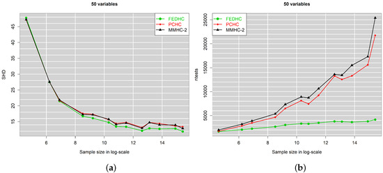 Figure 10 shows the SHD and the number of CI tests executed by each algorithm against the sample size. The MMHC-1 evidently has the poorest performance in both axes of comparison. Our implementation (MMHC-2) performs substantially better, but the overall winner is the PCHC. FEDHC, on the other hand, performs better than MMHC-1, yet is the second-best option.
