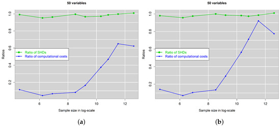 Extensive experiments were conducted on simulated data to investigate the quality of the estimation of FEDHC compared to PCHC and MMHC-2. MMHC-1 participated in the simulation studies only with categorical data and not with continuous data, because it is prohibitively expensive. The continuous data were generated by synthetic BNs that contained a various number of nodes, , with an average of three and five neighbours (edges) for each variable. For each case 50 random BNs were generated with Gaussian data and various sample sizes. Categorical data were generated, utilising two famous (in the BN learning community) realistic BNs, and the sample sizes were left varying. The R packages MXM [43] and bnlearn were used for the BN generation, and the R packages pchc and bnlearn were utilised to apply the FEDHC, PCHC, MMHC-2 and the MMHC-1 algorithms, respectively. All simulations were implemented in a desktop computer with an Intel Core i5-9500 CPU at 3.00 GHz with 48 GB RAM and an SSD installed. The R codes for the simulation studies are available in the Supplementary Material.