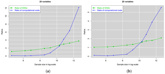 The function utilised in the continuous data case relies on the coefficients. The larger the magnitude of their values, the stronger the association between the edges becomes, and hence, it becomes easier to identify them. For BNs with categorical data, one could apply the same generation technique and then discretise the simulated data. To avoid biased or optimistic estimates favoring one or the other method, two real BNs with categorical data were utilised to simulate data. These are (a) the Insurance BN, used for evaluating car insurance risks [45], which consists of 27 variable (nodes) and 52 (directed) edges and (b) the Alarm BN, designed to provide an alarm message system for patient monitoring, and consists of 37 variables and 45 (directed) edges. The R package bnlearn contains a few thousand categorical instantiations from these BNs, but for the purpose of the simulation studies more instantiations were generated using the same package. The sample sizes considered were .