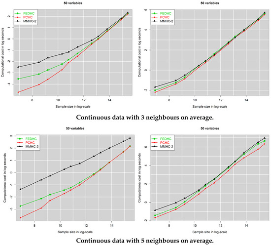 The computational cost of each algorithm was also measured, appearing in Figure 11 as a function of the sample size. The empirical slopes of all lines in Figure 11 are nearly equal to 1, indicating that the scalability of FEDHC, PCHC, and MMHC-2 is linear in the sample size. Hence, the computational cost of all algorithms increases linearly with respect to the sample size. For any percentage-wise increase in the sample size, the time increases by the same percentage. Surprisingly enough, the computational cost of MMHC-1 was not evaluated for the categorical data case, because similarly to the continuous data case, it was too high to evaluate.