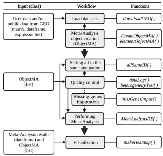 Moreover, DExMA allows users to download data from the GEO database simply by using the corresponding codes. In addition, it includes quality control steps and heterogeneity testing. This package is available in the Bioconductor repository (http://bioconductor.org/packages/release/bioc/html/DExMA.html, accessed on 31 August 2022).