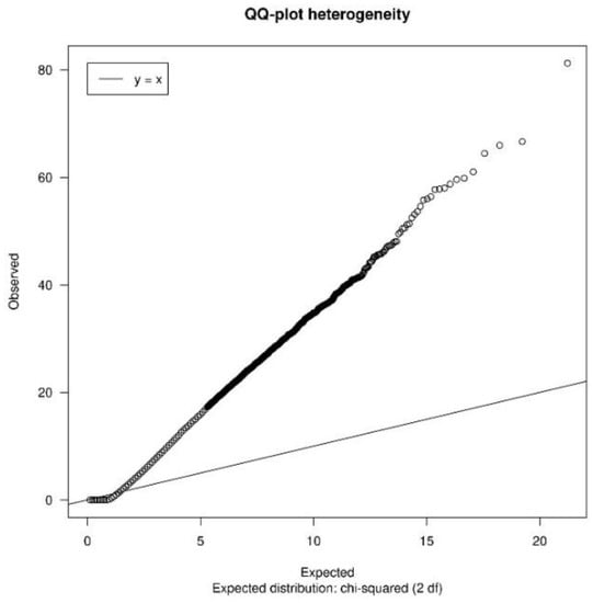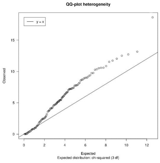 On the one hand, it returns a QQ-plot of Cochran’s heterogeneity test (Figure 2) []. In the case of homogeneity, it is expected that the majority of the values will be close to the expected distribution (the central line of the graph).