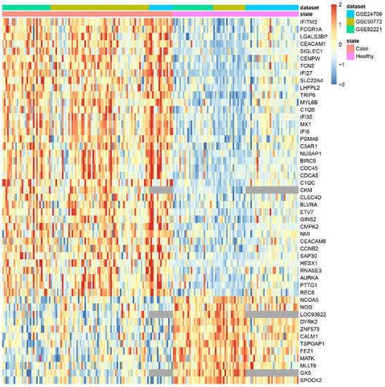 The data used in the case study are available in the ADEx database [] (https://adex.genyo.es/, accessed on 15 August 2022). Specifically, we downloaded the following datasets: GSE24706, GSE50772, and GSE82221_GLP10558. Once the studies were downloaded, four files were obtained: