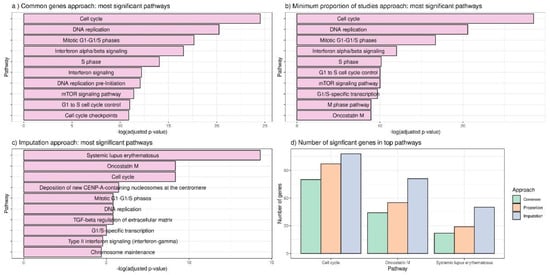 Graphical representations of the most significant pathways for each of the meta-analysis approaches. (a) Ten most significant pathways in common genes approach. (b) Ten most significant pathways considering genes that are contained in at least two studies. (c) Ten most significant pathways in the missing genes imputation approach. (d) Number of significant genes in top pathways in each approach.
