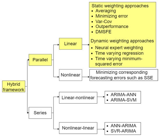 Time series prediction has been a challenging task for over five decades. A large amount of literature has focused on the method to obtain accurate forecasts in numerous practical applications. In general, two main methods can improve the accuracy of forecasting results: (1) developing and proposing new forecasting models and (2) hybridizing existing forecasting models. Based on the advantage of the combination forecast technique from the previous section, we focus on only the hybrid model. The famous hybrid structure consists of the parallel and series hybrid structures []. The linear combination of parallel structures is challenging for researchers. The main aim of this area is to seek the optimal weight of each forecast. The framework of two classifications of hybrid structures is shown in Figure 1.