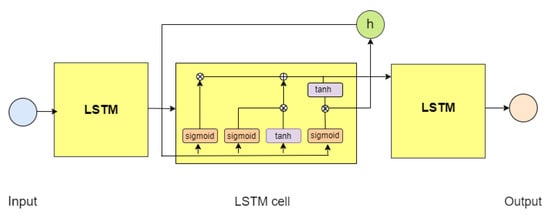 A long short-term memory (LSTM) network is a type of recurrent neural network capable of handling long-term dependencies between data by controlling the input gate, the forget gate and the output gate. The benefit of LSTM is that it is insensitive to the input data length compared to other methods that handle series of data []. The weakness of LSTM is that the big data and massive processing time for training are required [].