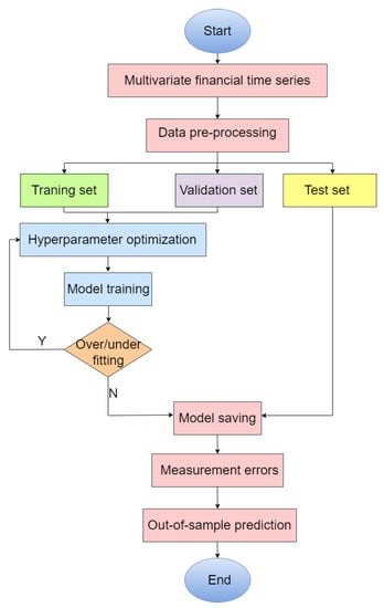 We then focused on the data pre-processing before applying for model training and testing. After obtaining data from the Thomson Reuters database, we cleaned up any errors and filled in any missing data using a splines interpolation method. The data consists of five input variables: the opening price, highest price, lowest price, closing price and volume. In addition, we aimed to forecast the closing price at the end of every 5 min of trading. The historical financial data series were divided into three sets—namely, the training, validation and test sets.