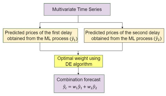 To improve the single deep learning forecast accuracy, a linear combination forecast is proposed. Many researchers have studied this topic and built several combination forecast techniques to improve the forecast accuracy []. In this paper, we propose the two-delay combination using the deep learning method to predict the closing prices. The general two-delay combination forecast can be defined as []