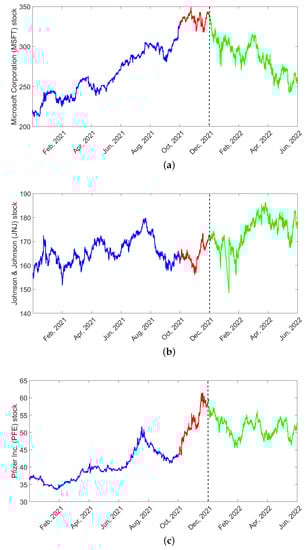 It can be noticed in Figure 7 that the original closing prices of the training and validation sets for three different stocks are non-stationary. The MSFT stock shows an upward trend. JNJ displays fluctuations, while Pfizer Inc. presents an upward trend with slight fluctuations. Moreover, it is interesting to consider the JNJ and PFE stocks because they are the USA’s large pharmaceutical companies that sell medications and COVID-19 vaccines internationally.