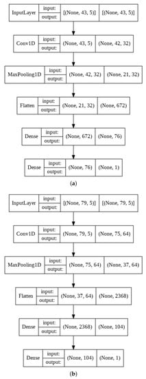 After that, the one-dimensional vector is passed through a dense layer and sent to the final output layer. In a one-day trading delay, the CNN architecture process is similar to a half-day trading delay, except the previous one-day OHLVC values (79 observations) are added to the model. The CNN model consists of only one convolution layer that extracts 64 feature maps from the input data with a kernel of size 5. After the max-pooling step, the size of the feature maps to 37. The output flatten later is (None, 2368) shows that we flatten the output of the convolutional layers to create a one-dimension vector (). Next, the number of neurons in the dense layer is 104. Finally, the closing prices for the next timestamp are computed using the 104 nodes at the output of the dense layer.
