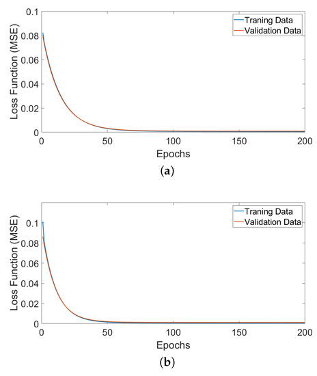 For deep learning forecasting, overfitting is one of the most significant problems in training neural networks. This occurs when the model performs well on training data but generalizes poorly to unseen data (the training loss is significantly lower than the validation loss) []. The weight regularization (-sum of the squared weights) is one of the regularization techniques added to the architectures [] to deal with the overfitting issue. The loss curve against epochs of the selected deep learning network architecture is illustrated in Figure 9.