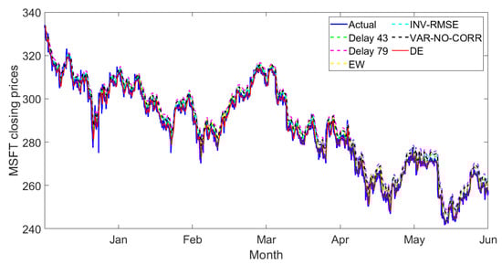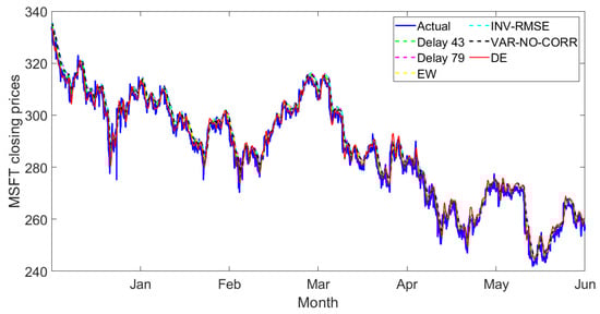 The red lines show the predicted closing prices obtained from the two-delay combination model using the DE weight-optimization algorithm. The predicted prices obtained from the single delay and two-delay combination predictive models show similar stock price patterns to the actual stock prices. Our proposed combination model via DE weight optimization performed better than the individual forecast and the state-of-the-art weight linear combination because our proposed model provides the lowest RMSE and MAPE for all stocks.