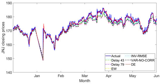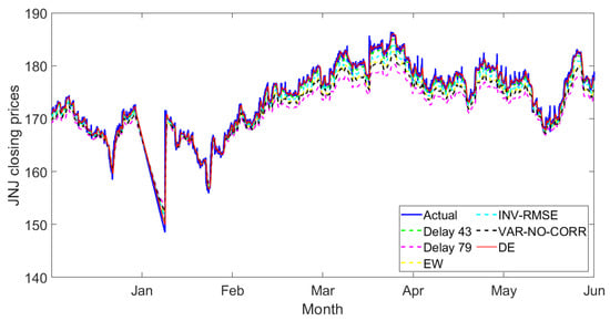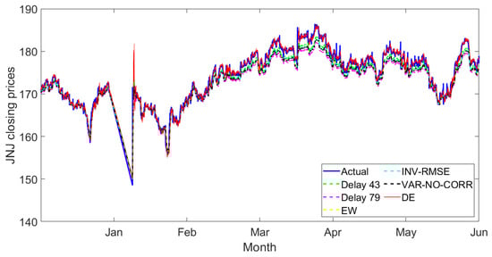 Figure 10, Figure 11, Figure 12, Figure 13, Figure 14, Figure 15, Figure 16, Figure 17 and Figure 18 present the observed closing prices compared to the predicted prices obtained from the individual delay deep learning and combination models between January and June 2022. For all figures, the blue lines display the actual closing prices, and the green and magenta dashed lines represent the predicted closing prices obtained from individual deep learning models with half-day and one-day delays, respectively. The yellow, cyan and black dashed lines refer to the two-delay combination method obtained from the state-of-the-art methods—namely, the equal weights, the inverse of RMSE weights and the variance-no-covariance weight methods.