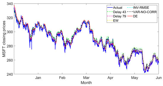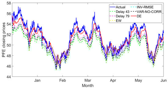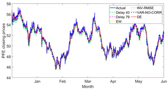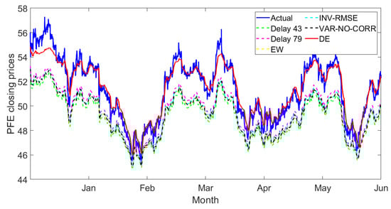In addition, the predicted prices are matched to the actual prices when using the LSTM model because this model is capable of handling long-term dependencies. Another exciting thing is that our proposed technique via the DE weight optimization method is outstanding when the individual method performs poorly in predicting the observations. For example, in Figure 18, all individual and state-of-the-art combination methods provide low performance (underestimate) to predict the Pfizer stock.