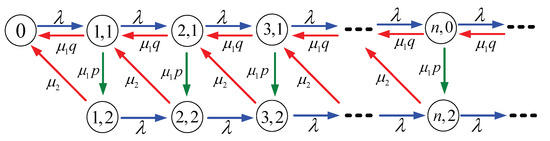 We set , as the load coefficients of node 1 and node 2, respectively. Then, , . We denote the number of block in node 1 and node 2 by and , respectively. By Jackson’s Theorem, the steady-state probability of the network can be expressed as follows:
