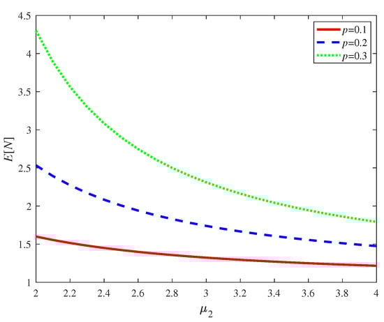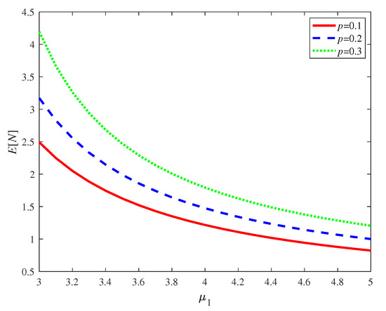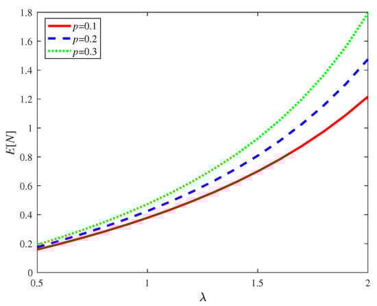 Figure 3 shows how the average number of blocks depends on when and . Note that when the p is constant, increases and increases. When is constant, increases and p increases. This numerical result can be intuitively understood as follows. When increases, the number of blocks increases; hence, increases. When p increases, the number of blocks that can reach consensus increases; thus, increases.