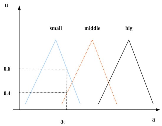 In real life, it is easy to encounter vague language such as “higher”. In order to describe the fuzzy variables existing in this language more clearly, some scholars put forward the concept of fuzzy set and choose to use the membership function to describe it []. The triangle is a commonly used function to discuss fuzzy set theory, as shown in Figure 2.