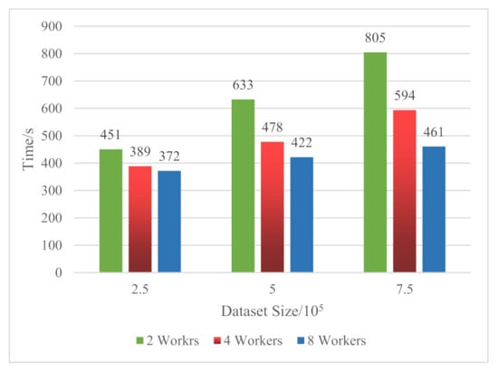 It can be seen from Figure 6 that the data scale increases, and the running time also increases with different numbers of workers. Taking the running time of two workers as an example, the running time of the 2.5 × 105 dataset is 451 s, the running time of the 5 × 105 dataset is 633 s, and the running time of the 7.5 × 105 dataset is 805 s. Taking the running time of four workers as an example, the running time of 2.5 × 105 dataset is 389 s, the running time of 5 × 105 dataset is 478 s, and the running time of 7.5 × 105 dataset is 594 s. Taking the running time of eight workers as an example, the running time of the 2.5 × 105 dataset is 372 s, the running time of the 5 × 105 dataset is 422 s, and the running time of the 7.5 × 105 dataset is 461 s.