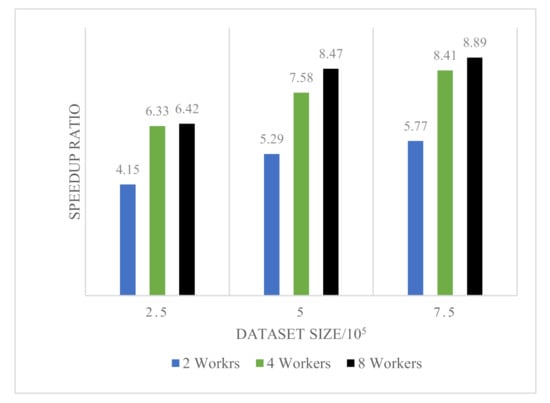 According to Figure 7, under different data scales, the speedup ratio of the algorithm is not the same, but the overall increase. From the data scale set of 2.5 × 105, the speedup ratio of two workers is 4.15, the speedup ratio of four workers is 6.33, and the speedup ratio of eight workers is 6.42. From the data scale set of 5 × 105, the speedup ratio of two workers is 5.29, the speedup ratio of four workers is 7.58, and the speedup ratio of eight workers is 8.47. In terms of the data scale set of 7.5 × 105, the speedup ratio of two workers is 5.77, the speedup ratio of four workers is 8.41, and the speedup ratio of eight workers is 8.89.