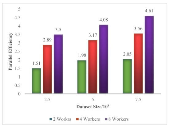 It can be seen from Figure 8 that under different Amazon data scale sets, the parallel efficiency of the algorithm improves. Taking the running efficiency of two workers as an example, the parallel efficiency of the 2.5 × 105 dataset is 1.51, the parallel efficiency of the 5 × 105 dataset is 1.98, and the parallel efficiency of the 7.5 × 105 dataset is 2.05. Although the parallel efficiency of the algorithm of two workers is not particularly high, with the increase of data sets, the parallel efficiency gradually improves. Taking the running efficiency of four workers as an example, the parallel efficiency of the 2.5 × 105 dataset is 2.89, the parallel efficiency of the 5 × 105 dataset is 3.17, and the parallel efficiency of the 7.5 × 105 dataset is 3.56. This parallel efficiency also gradually improves with the increase of the data set. By comparing the parallel efficiency of two workers and four workers, it can be clearly seen that the increase of the number of workers and the growth of the data set improve the parallel efficiency of the algorithm to a certain extent.