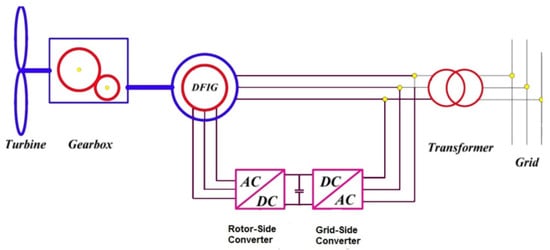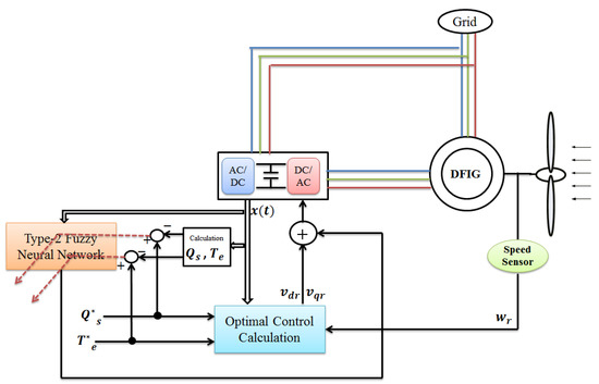 Among the different generators that are employed in modern wind-power-producing systems, doubly fed induction generators (DFIGs) have attracted maximum attention to themselves because of having advantages such as variable velocity action, the possibility of adjusting active and reactive power, and a low-cost transformer [,,,,]. Usually, double-feed generators have a back-to-back converter in the rotor circuit, which share the DC link. With proper control, these generators can be made to deliver power to the grid at ultra-synchronous speeds. Normally, the delivery power of these converters is between 25% and 30%. The extensive presence of wind turbines in modern power systems affects the dynamic behavior of the system and makes it more complex. This makes the use of advanced methods to control these systems more important. So far, many methods have been employed in relation to the control of DFIGs [,,,]. Generally, the control of the power elements in the DFIG rotor circuit is performed by proportional–integral (PI) robust controllers. However, the performance of the controlled system, despite these controllers, is not desirable due to the need for machine parameter values and power system dynamics to properly adjust their gains. Studies related to the stability analyses of the small signal of DFIG wind farms connected to the network have mainly considered a definitive approach to stability analyses, that for the oscillation nature of the wind, such analyses are very optimistic and will result in a particular operation point. For the stability analysis of such a system, Monte Carlo simulation methods in some studies have been proposed [,,,]. In [], an optimal multi-purpose PI controller with the directional evolution (DE) algorithm for DFIGs was proposed, where specific methods were used to apply limits and multi-objective optimization problems that increased the complexity of the controller design. To track the optimal power of the DFIG wind turbine system, a nonlinear controller with the sliding mode method was designed []. PI controllers play an important role in relation to DFIGs. However, to reach the power’s desired quality levels required in the new industry, new advanced methods are needed for controlling these generators. The reader is refereed to [] for more information on the methods utilized for controlling DFIG wind turbine systems.