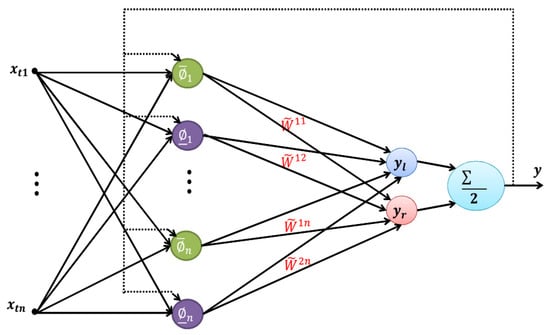 where and are the left and right switching points, respectively, which can be calculated using the trial-and-error method or the Karnik–Mendel (KM) algorithm [,]. Moreover, , , , and are the mean value of the first-layer neurons, weights, center of weights, and spread of weights, respectively. Finally, the network general output can be calculated as follows: