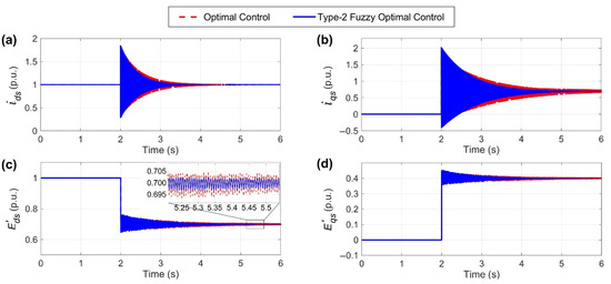 Although there were several ways to select the matrix among the infinite possible SDC displays, only one of them will lead to the optimal performance of the closed loop system, the detection of which is very difficult. As a result, the only condition for selecting was that the relation of was established. The results related to the performed simulations in the presence of optimal control with and without a type-2 fuzzy compensator controller are given in Figure 2. Figure 4a–d are related to the current signals of the stator and its transient voltage along the q and d vectors. It is assumed that a disturbance was applied to the system in . As can be seen, the result signals of the optimal controller (with and without a type-2 fuzzy compensator) by damping the created oscillations were adjusted to their desired equilibrium points. Figure 5a,b are also related to the and control signals produced by the mentioned controllers, respectively.
