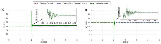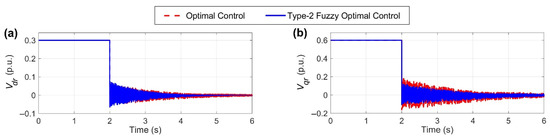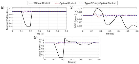 To challenge the proposed control system, it was assumed that a three-phase-to-ground fault was applied at , and within 0.1 s, the breaker worked. Figure 6 shows the optimal control system performance (with and without a type-2 fuzzy system) without any control system. In Figure 6a, at , a three-phase-to-ground fault had occurred. In fact, by applying this fault, the performance of the control system was challenged. The fault was assumed to last for 0.1 s and ended at . Reaching 0.5 p.u. was the saturation limit of the system, assumed to be fixed there in the simulation.