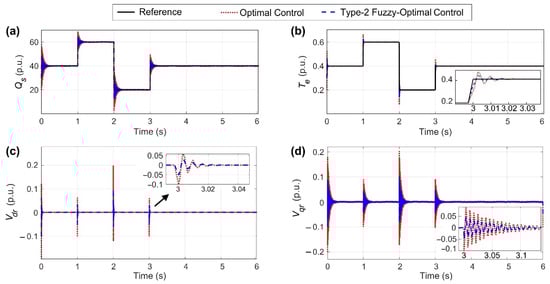 The shapes of (a–d) are related to the stator reactive power and electromagnetic torque tracking performance and created control signals by optimal control (with and without the type-2 fuzzy system).