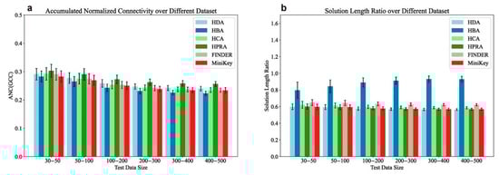 In the testing phase, synthetic graphs were generated, maintaining m = 4, but with varying node numbers divided into scales: 30–50, 50–100, 100–200, 200–300, 300–400, and 400–500. For each node size category, we created 100 test graphs. Subsequently, we gauged the performance of several algorithms, namely, HDA [], HBA [], HCA [], HPRA [], FINDER [], and MiniKey, on these generated datasets. This methodology ensured a comprehensive evaluation, permitting a detailed comparison of the methods across different graph sizes.