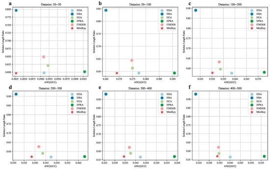 Comparison of pareto frontiers across different methods on six simulated datasets (a–f). MiniKey has the best performance when considering both ANC and SLR metrics simultaneously.