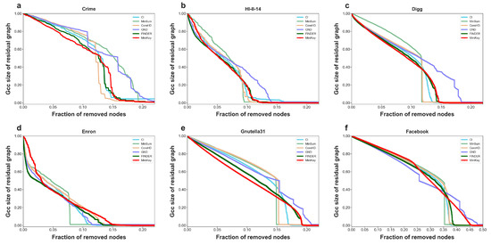 Furthermore, we compared MiniKey with network critical node identification algorithms that can run on large-scale networks, such as CI [], MinSum [], CoreHD [], GND [], and FINDER []. Table 2 and Figure 4, respectively, present the ANC score and the ANC curves of different methods on six real-world datasets. From the results, we can observe that FINDER and MiniKey consistently outperform the other methods across all datasets. Specifically, on Crime, HI-II-14, and Digg datasets, FINDER and MiniKey excel by providing the most accurate identification of key nodes. For the Gnutella31 and Facebook datasets, although BPD and MiniKey perform slightly better, FINDER still delivers results that are quite close to the top performers, indicating its effectiveness in key node identification.