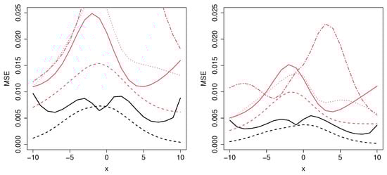 Note that, in Scenarios 1–4, the MSE in Equation (5) will be represented for a grid of covariate values. However, since in Scenarios 5–8 there are two covariates which influence the cure rate, the MSE is represented in a contour plot. The results related to Scenarios 1–8 are shown in Figure 2, Figure 3, Figure 4, Figure 5, Figure 6, Figure 7, Figure 8 and Figure 9, respectively.