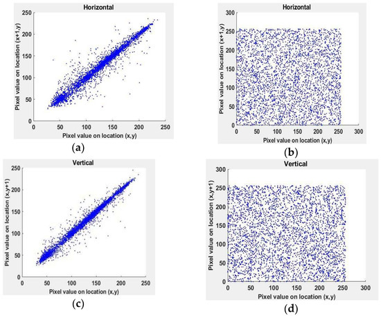 An efficient encryption method should be susceptible to minute variations in the key. It should not be decrypted by a key that might even differ from the actual key. The smallest changes in the decryption key should lead to a significant alteration in the output. The key generated by the proposed chaotic map is directly dependent on parameters a, c and d. It has been observed that a change as small as 10–16 for a and 10–15 for b and c show a significantly different output. Hence, the proposed system is susceptible to minuscule variations in the key generated by the proposed hybrid map. Good encryption should have a large keyspace. Such a system would be able to withstand third-party manipulations such as brute force attacks satisfactorily. The keyspace for encryption due to the proposed hybrid map in Section 3 is affected by the parameters a, c, and d and the initial values x0, b0, and p0 (initial values for each chaotic map dimension). The precision for parameter a has been observed to be 10–16, while for parameters c, d, and initial values x0, b0, and p0, the precisions have been observed to be 10–15. Thus, the keyspace is calculated to be 1016 × 1075 × 256 = 1.044 × 2184. The keyspace is hence large enough to render a brute-force attack unfeasible.