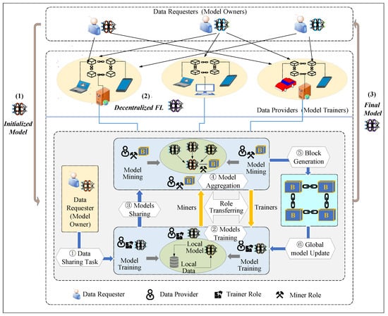 In this section, we consider such a decentralized data sharing system: it is built on top of a blockchain network and incorporates federated learning mechanisms to transform the data sharing process into a collaborative model training process. Importantly, the blockchain is no longer seen as a standalone network for storing data sharing evidence, but is tightly integrated with federated learning to achieve fully decentralized privacy-preserving data sharing. The framework structure and relevant modules of the system are shown in Figure 1, and we provide the following definitions.
