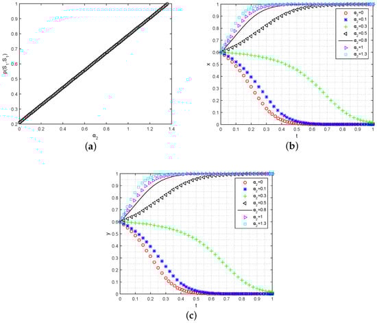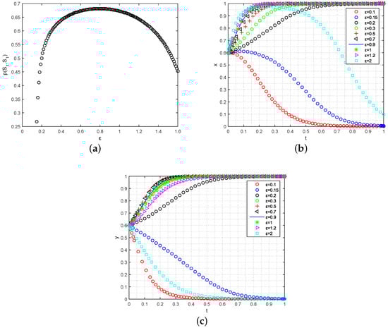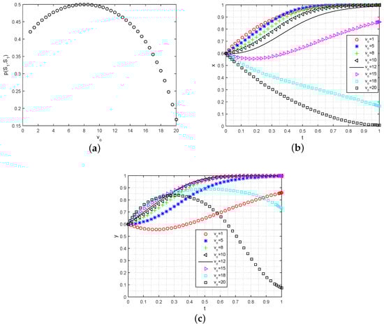 Figure 6. The simulation impact of on data sharing strategies’ evolution. (a) Analysis of on ; (b) analysis of on the strategy evolution for data requesters; (c) analysis of on the strategy evolution for data owners. - (4)