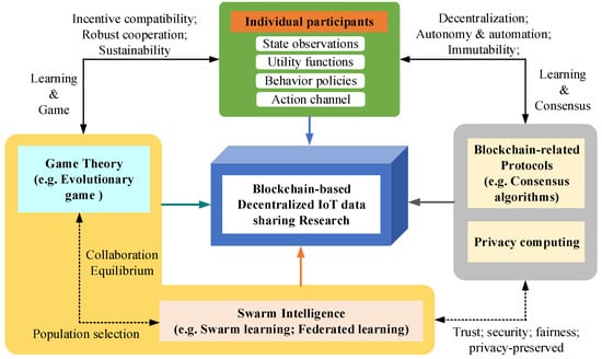 Based on the analysis mentioned above, we established a unified methodological framework for blockchain-based decentralized IoT data sharing research as shown in Figure 8, in which decentralized IoT data sharing can be seen as a multi-agent collaboration with blockchain as the underlying foundation. Compared with pure data content sharing, the data sharing method combined with an AI algorithm has a higher efficiency in mining data value, protecting data privacy, and improving edge intelligence. Therefore, a swarm intelligence module (such as swarm learning [] or federated learning []) can be introduced to transform the data sharing problem into a multiagent collaborative training or learning problem. To guarantee the decentralization characteristics in edge intelligence, some blockchain-related protocols and privacy computing algorithms can be integrated into the framework to design a decentralized and privacy-enhanced swarm intelligent algorithm, so as to promise fair, secure, and trustful edge data sharing. Further, since participants in IoT data sharing scenarios are assumed to have bounded rationality, they can determine their action policies according to state observations and utility functions, and the corresponding decisions they make will vary with individual profit scenarios. In order to maintain a robust and sustainable data sharing environment, game theory (such as evolutionary game theory [,,,]) can be adopted to adjust the population selection to determine the collaboration equilibrium.